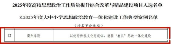 近日,教育部办公厅公布了2025年度全国高校思想政治工作质量提升综合改革与精品建设项目入选名单,我校申报的《以优秀传统文化为载体,助推“有礼”思政一体化建设》项目获评“2025年度全国大中小学思想政治教育一体化建设工作典型案例”。